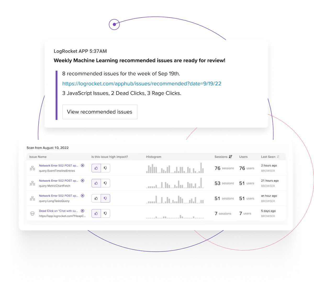 - Issue management: LogRocket ingests JavaScript errors, performance issues, UX issues, and frustrating moments. It then triages them and alerts you to the severe issues affecting user experience and key business goals