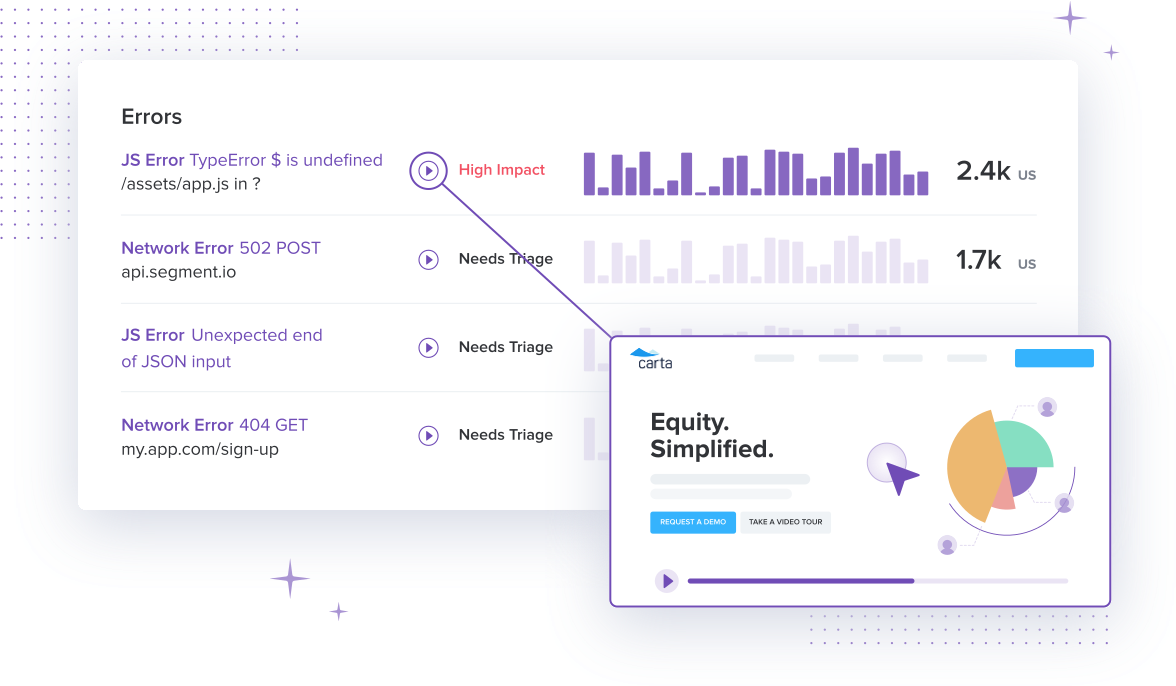 With all this data, you can easily collaborate across teams to determine whether a bug is worth fixing and ship a solution faster than ever. Find JavaScript errors impacting your goals, watch user sessions to understand and quantify how those issues affect your app’s UX, then route alerts and errors to the right person or team for a fix.